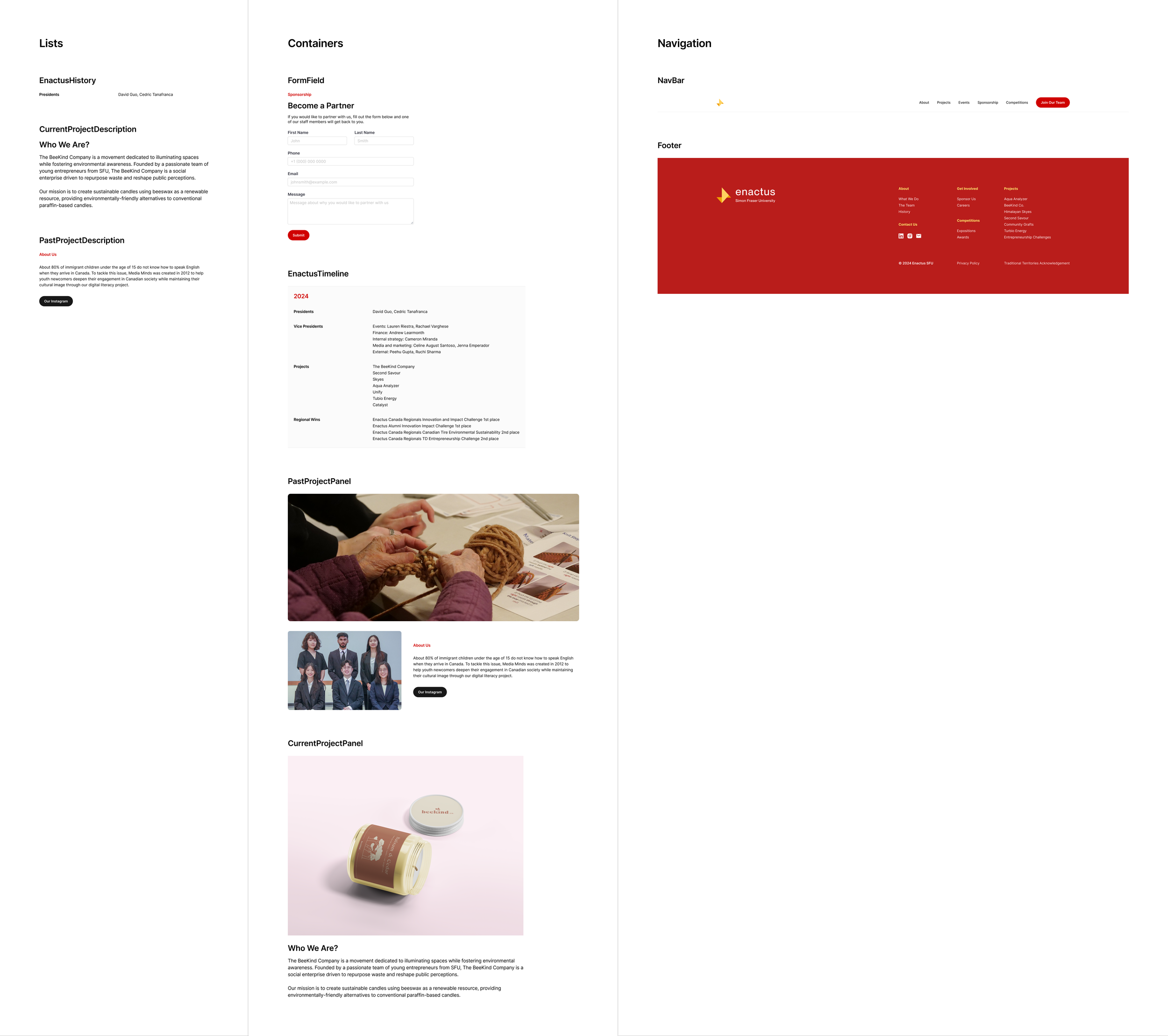 As part of the global organization Enactus, Enactus SFU is committed to expanding sustainable projects each year, empowering students to develop entrepreneurial skills and become future leaders. Through its website, Enactus aims to raise awareness of its mission and attract sponsors to support students on their journey.To streamline design and development, I created a comprehensive design system. I also collaborated with another UI designer to design the website’s user interface.